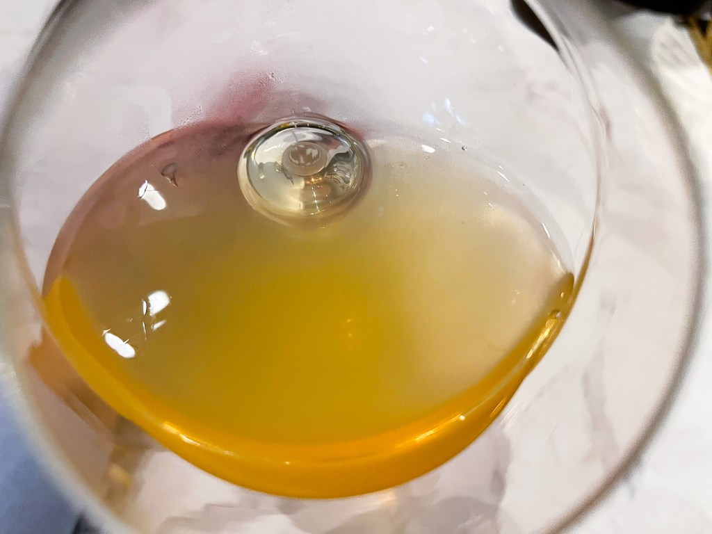 酒緣透明算是寬廣的,進入輕盈檸檬汁,然後一點橙色,集中酒體表現出深一點的橘果汁樣。酒杯經過搖晃,酒腿俐落滑下,酒面乾淨無雜質,是一款以優雅純淨輕色的橘酒。
