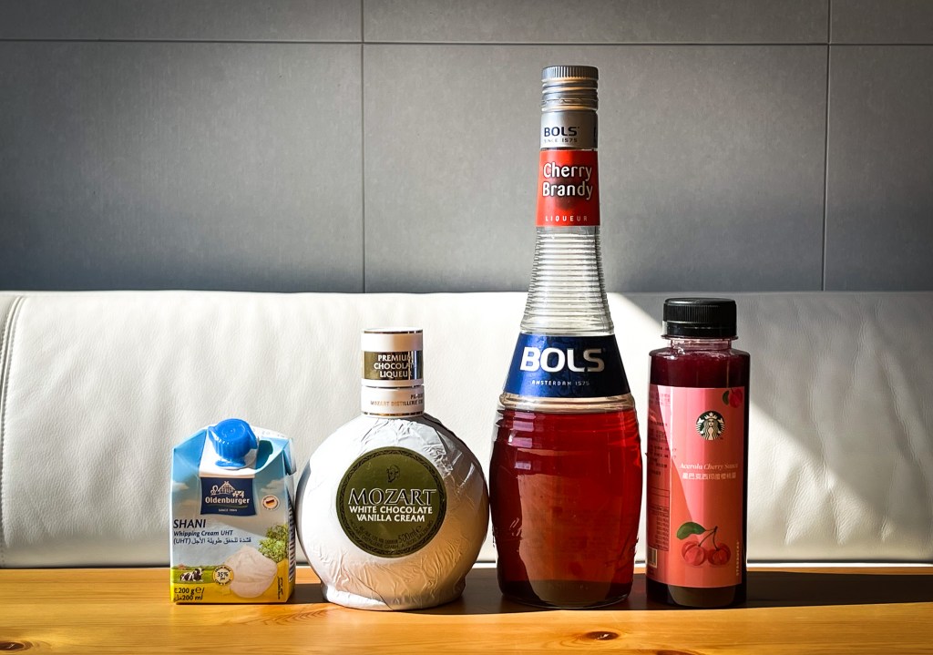 工欲善其事,所以器材先準備好,先將冰塊置入shake中,分別倒入20ml Cherry Brandy Liqueur、15ml White Chocolate Liqueur、15ml Acerola Cherry Sauce最後加入綿密的靈魂20ml Whipping Cream。