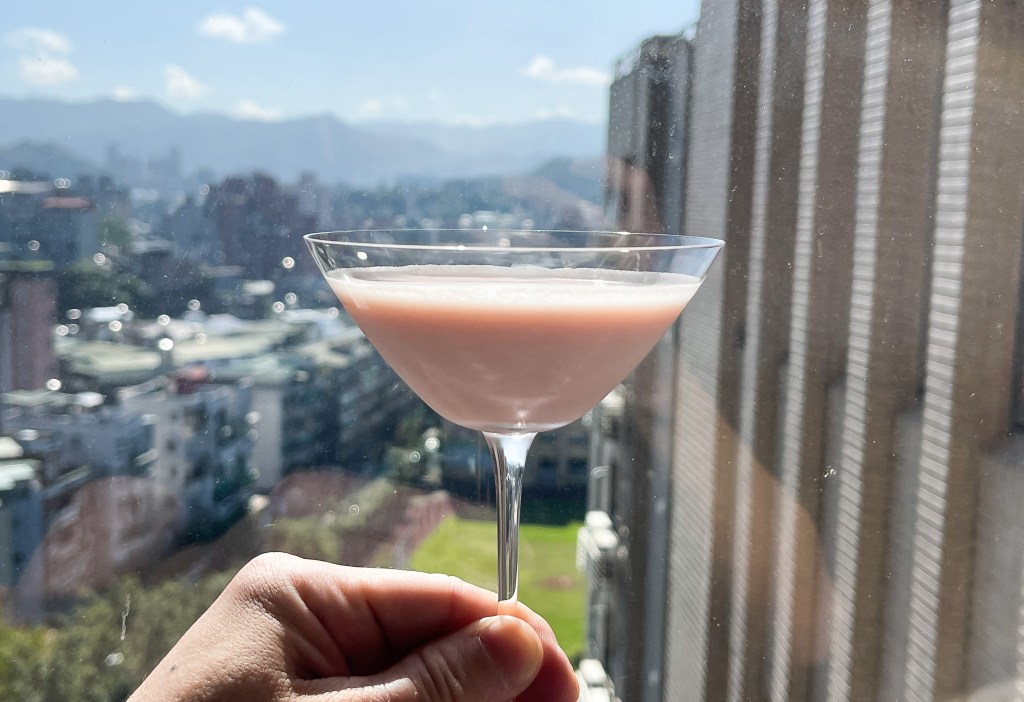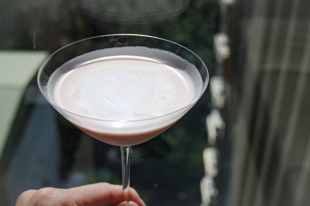 完成後,準備好一支馬丁尼杯,打開shake杯蓋,再取小濾網將搖盪好的雞尾酒透過濾網濾過至準備好的馬丁尼杯中,這就像過篩一樣,讓搖盪綿密的泡沫能夠更加細緻。