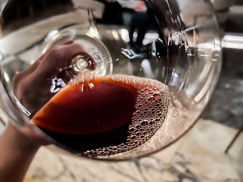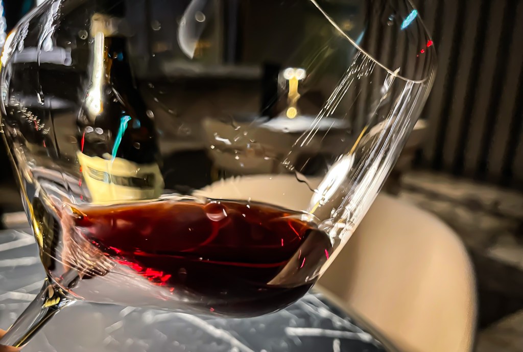 搖晃Riedel Nebbiolo/Pinot Noir酒杯,酒腿俐落沿著杯腹滑落,筆直俐落,酒面清澄乾淨而優美。
