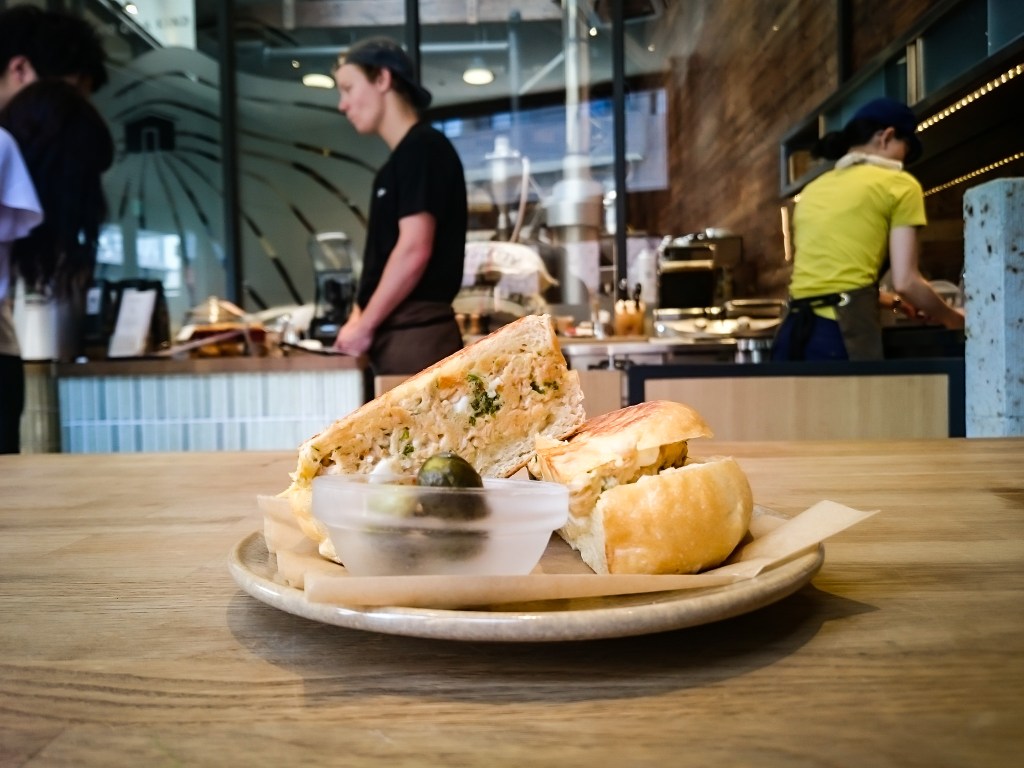 切半擺設外加一小盅橄欖,簡單不失設計感。他們的貝果是烤出一種薄脆的口感。