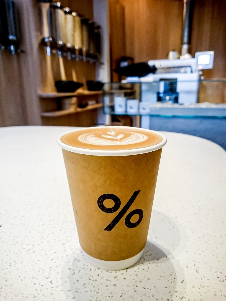 白色、世界地圖、%、以及烘豆室,構成咖啡館的四大元素,早上跑完步來到這裡,人煙較少,我輕鬆看著選單,決定來一杯溫熱的拉花的熱拿鐵,好舒緩一下身心,我就點了一杯% Arabica的熱拿鐵。
