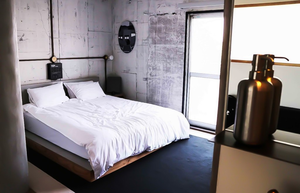 這天住的不是什麼大飯店,而是在臺灣也看得見許多老房重建的旅館類型,這間是位在東山,以老公寓重新翻新的公寓的酒店的RC HOTEL。旅館位置位在京都八坂上町,而這次旅行的運氣也不錯,服務的人員是來自臺灣臺南的女子,她說老闆也曾在臺灣留學過,而選擇在這棟長年以來作為單身公寓使用的住宅,經過改建而成的新潮旅店,除了延續這間50年老舊公寓的資產,也以不破壞原有風貌下為原則,再次以旅店的型態重新面世。從水泥灰岩的單色外牆,鐵製略帶鏽色圍欄,佇立在東山區前往清水寺的腰帶間。