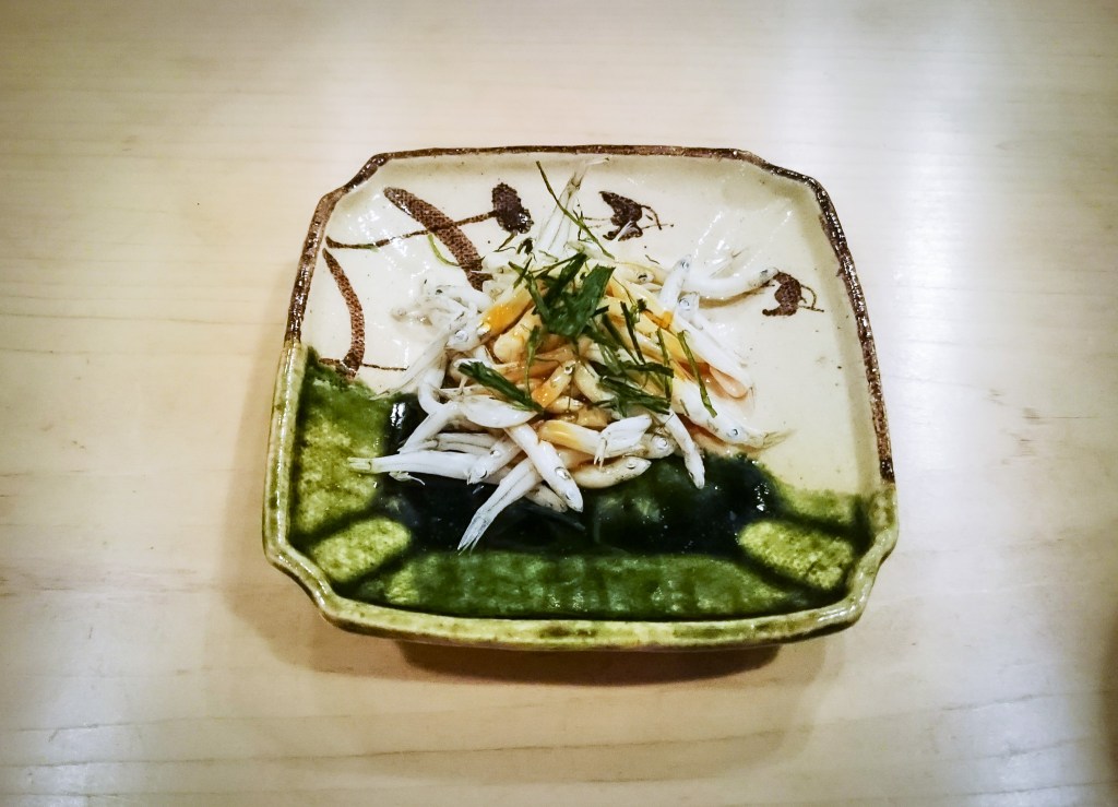 看來這是吻仔魚的季節,很多壽司會將它作為前菜,或是有這道菜,まつもと以吻仔魚以及切絲海苔調製,放置小盅作為前菜,很入味也可口。