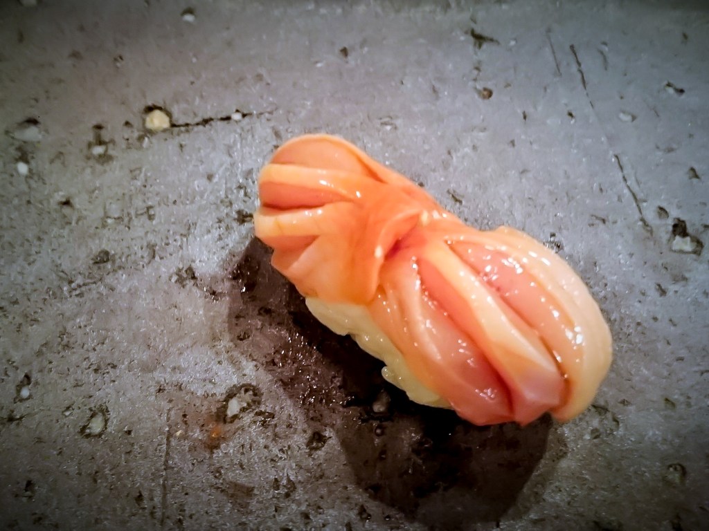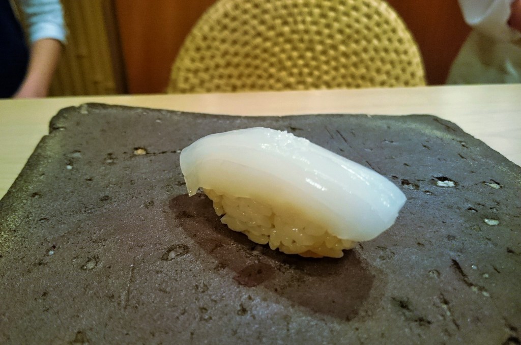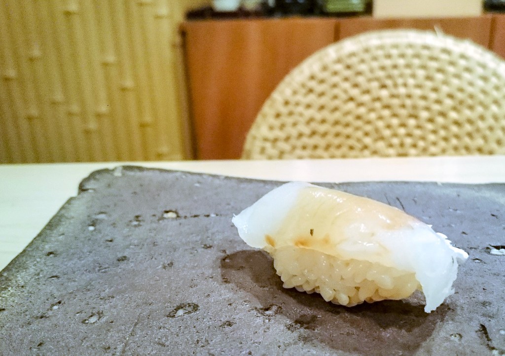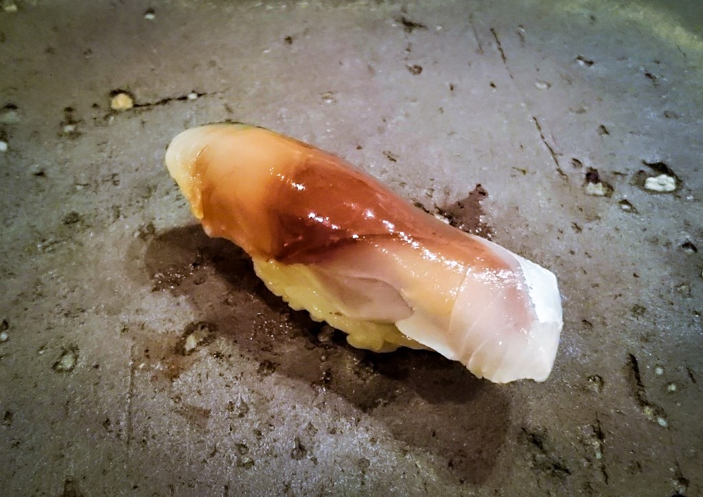 第二貫握壽司是墨烏賊,雪白的肉身放了一些粗海鹽,入口前有股蠻強勁的鹽味滑勁,咀嚼時還有些脆口,在尾段也會黏稠感,由於餐所使用的醋飯較悶酸,因此滋味上會比較感受到醋的滋味。