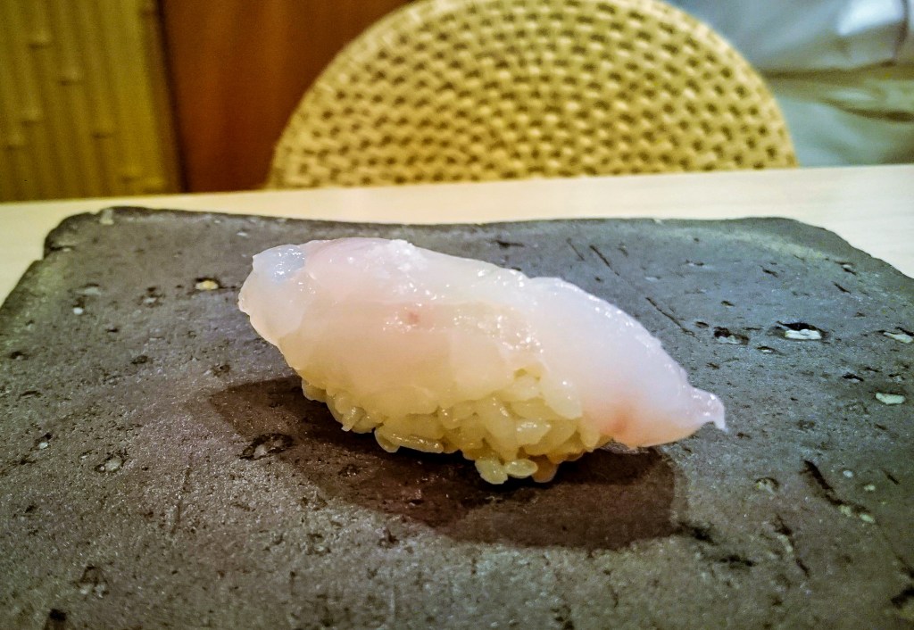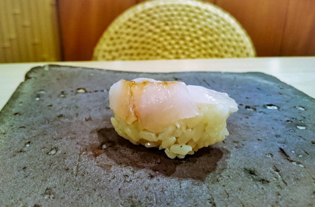 第一貫握壽司是鱸魚,清白的肉身,刷上薄薄的醬油讓這貫的口感柔軟滑嫩,而醋飯是微溫舒適。
