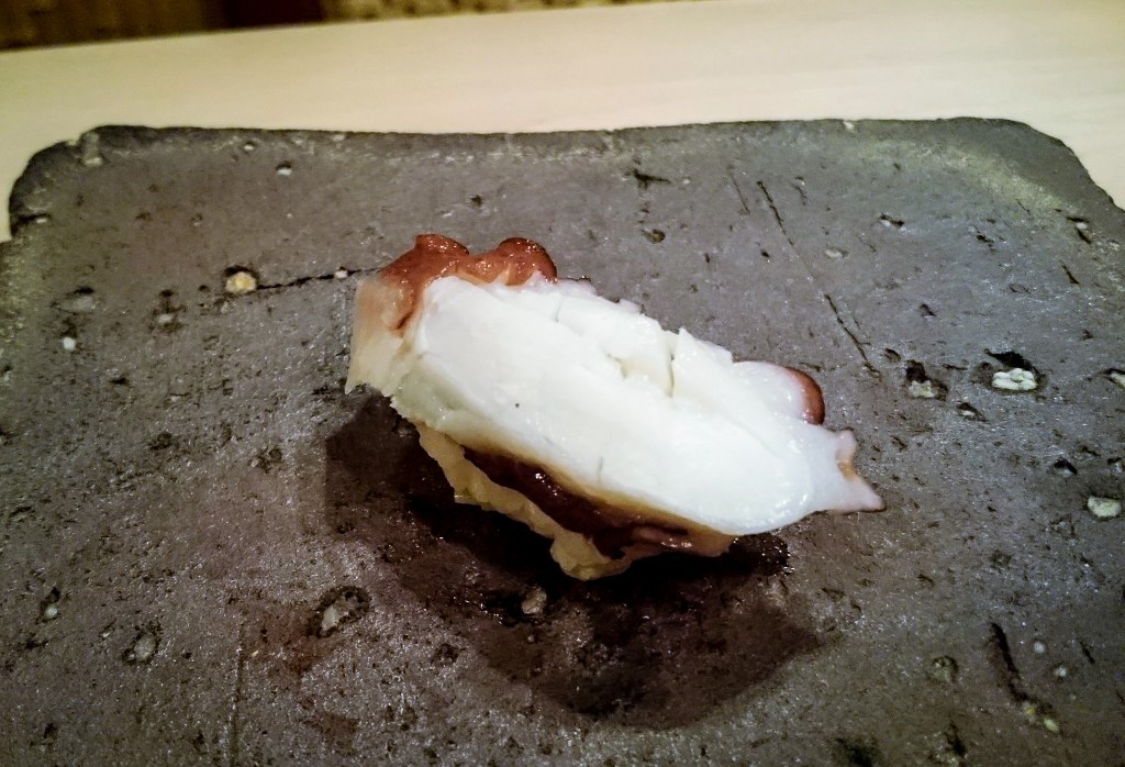 師傅送上刷上一層黑甜醬為壽司之後說出了「貝」…將壽司放在壽司臺前,吃下,這貫壽司除了味道香噴外,貝肉也十分很新鮮且有嚼勁兒其重點是黑醬香甜。很厲害…如果有穴子、我期待了。