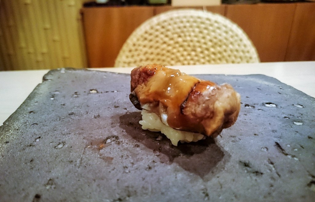 最後一貫是星鰻握壽司,這裡的星鰻不是剛煮完後會溫熱的星鰻,而是有些冰涼刷上一層黑醬,一樣好吃。