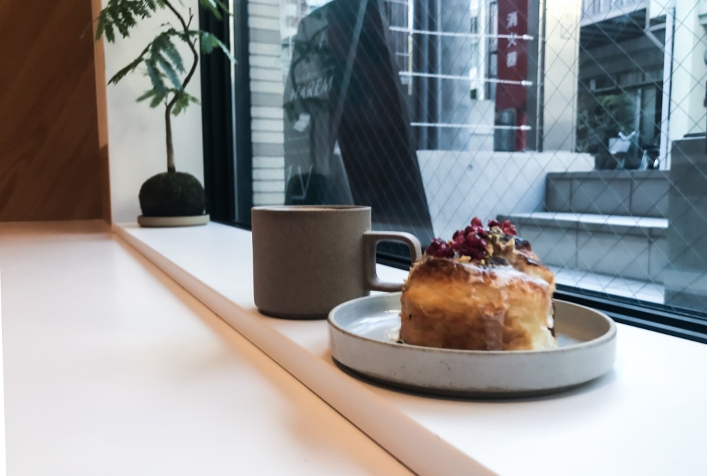 隨口再咬下,還真的挺不錯的,帶著冬日草莓的情懷還包括開心果粒以及其他繽紛滋味的料理,一口肉桂捲一口咖啡,全身放鬆了許多。