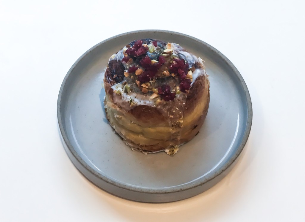 莓果糖霜的肉桂捲,帶些肉桂的繽紛氣息,吃下後的感受,其口味並非厚重,蔓越莓果粒及糖霜吃起來香甜酥軟,冬日總是表現出讓人欣喜的心情。