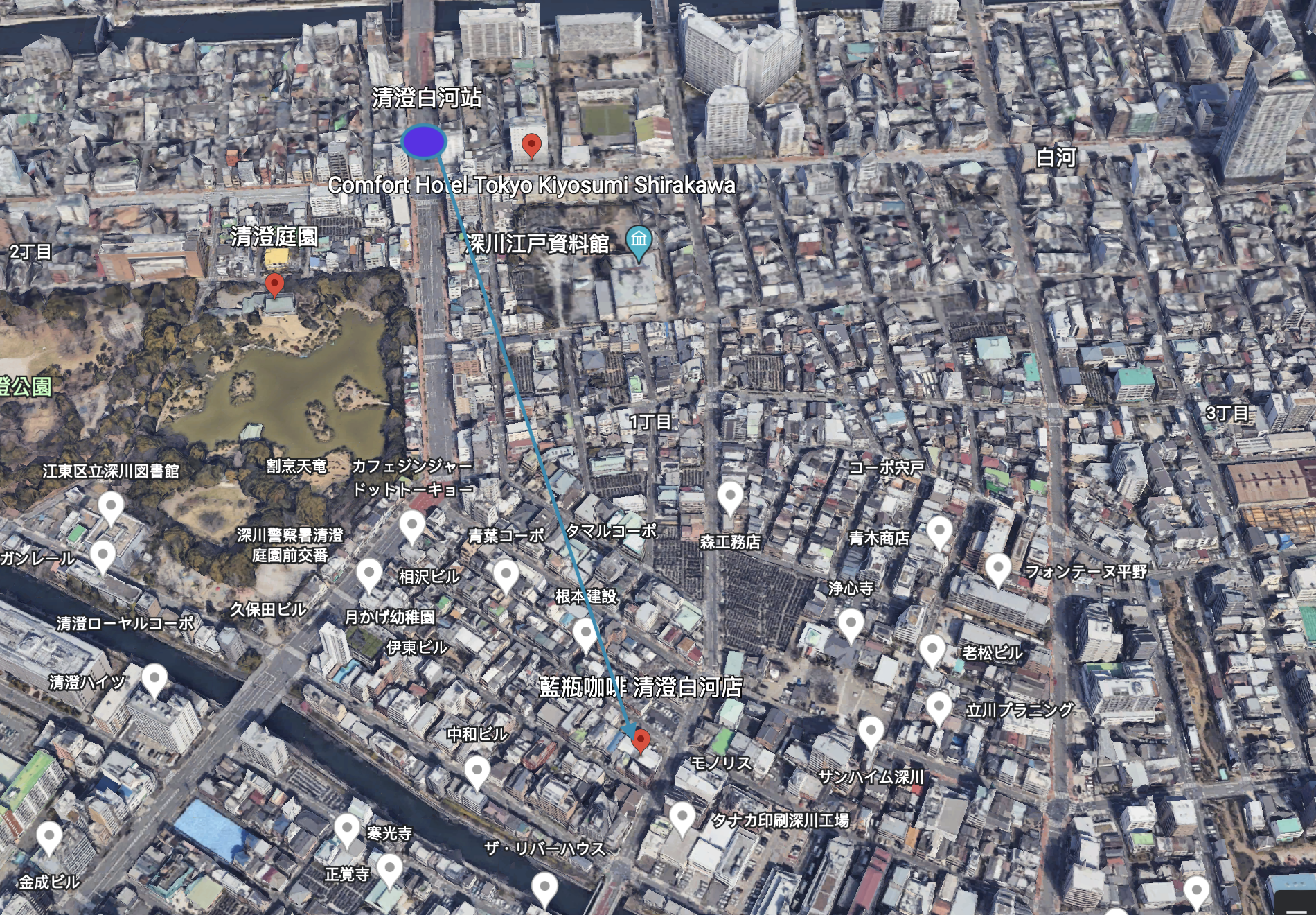 BLUE BOTTLE COFFEE KIYOSUMI-SHIRAKAWA(35.68N, 139.80E)。
