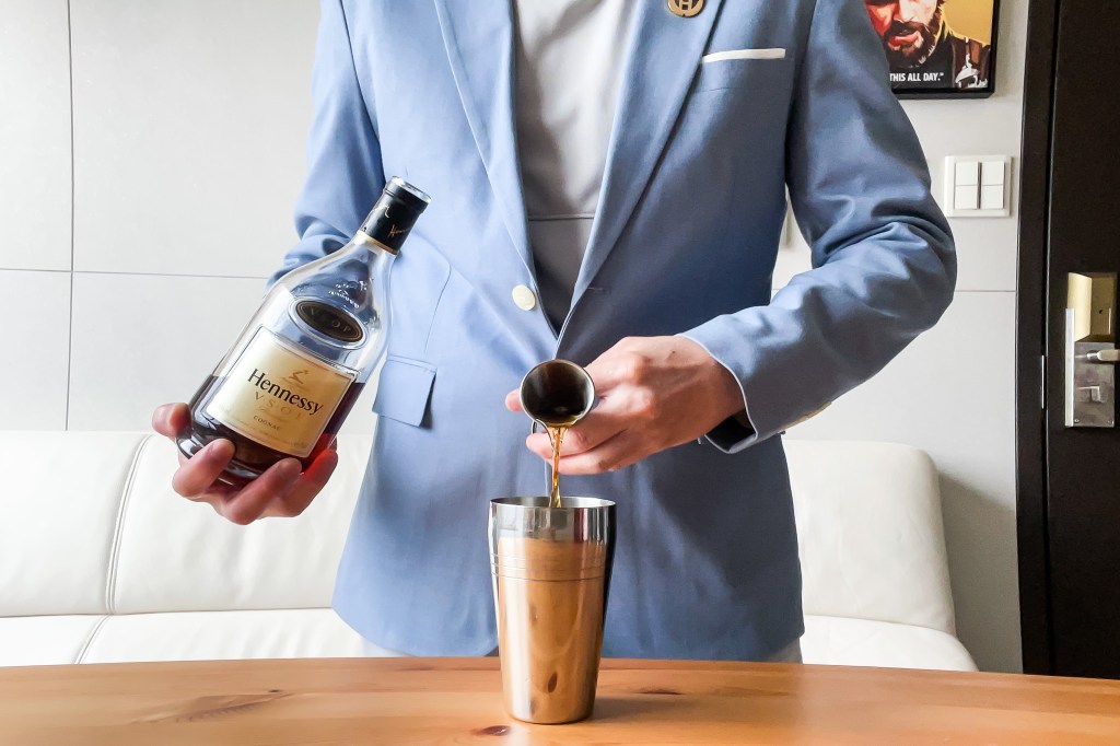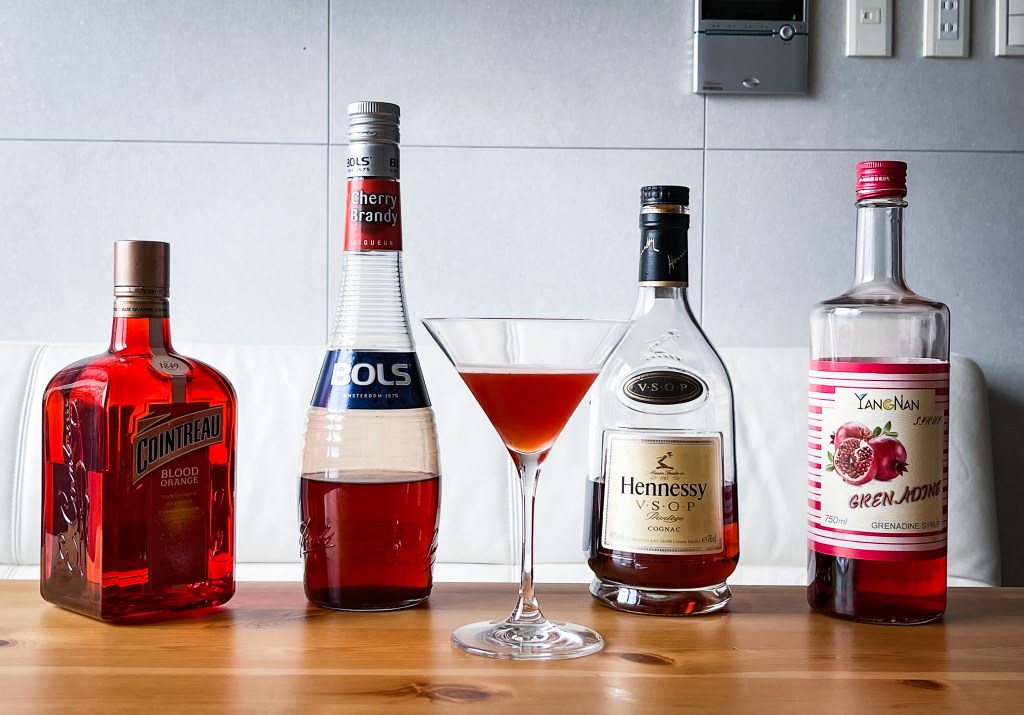 在Shake杯裡依序加入了30ml的干邑白蘭地以及30ml的櫻桃白蘭地,接著注入君度橙酒,不過剩下血橙,以此替代並注入15ml,接著再用攪拌棒的匙面,先後以石榴糖漿以及檸檬汁均概約一匙的量注入杯中,然後加入冰塊,蓋上杯蓋即可開示搖盪,但是並不需要搖得太久,調和即可。