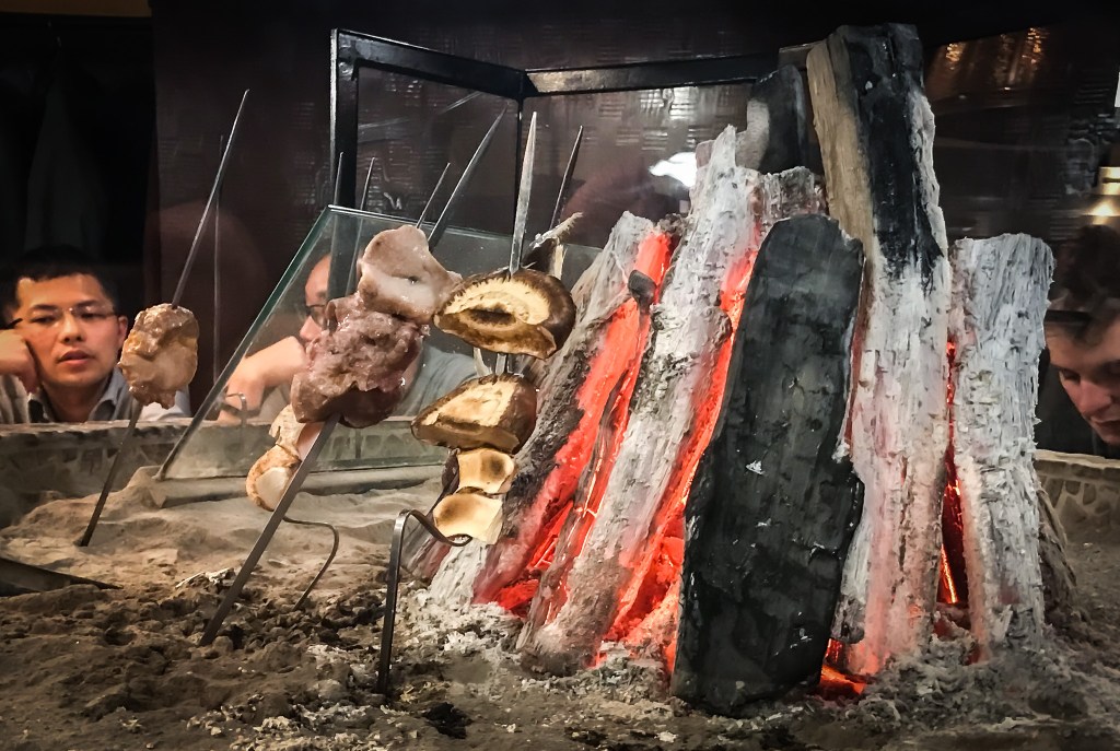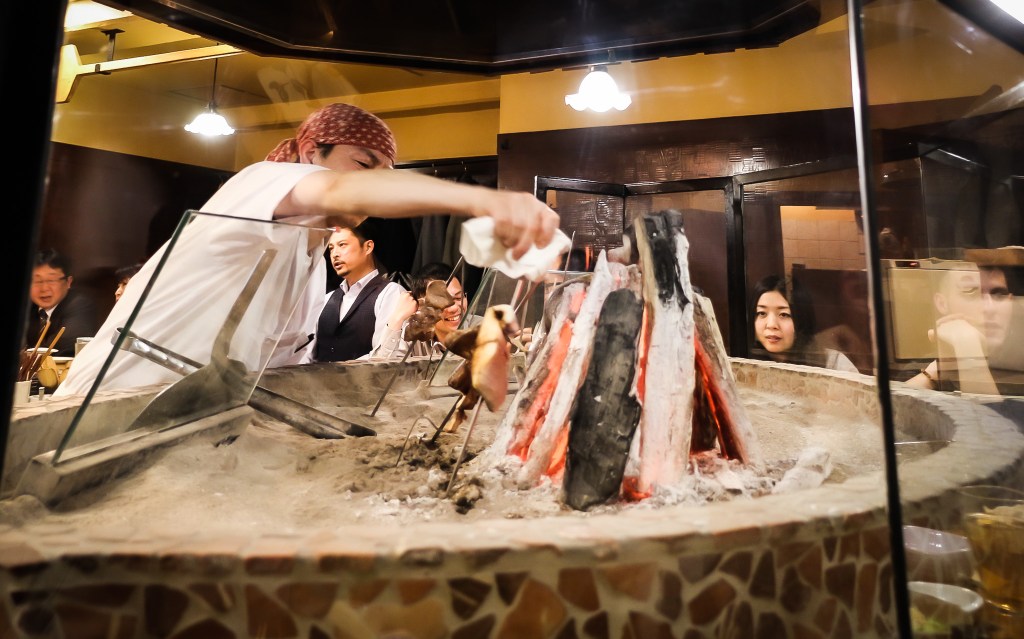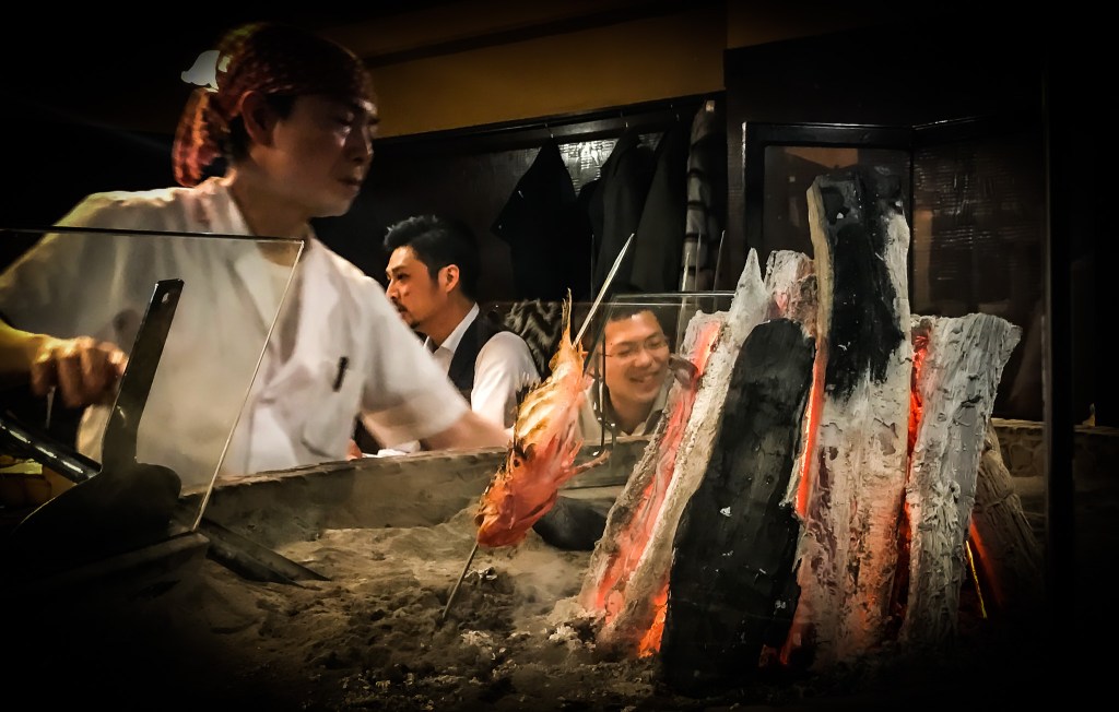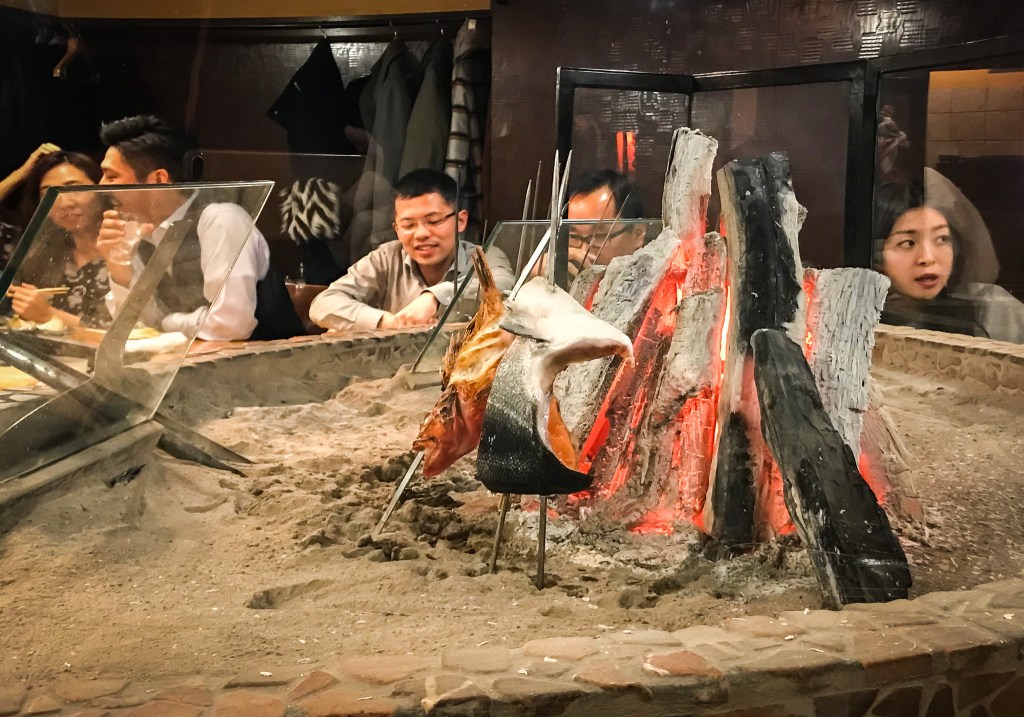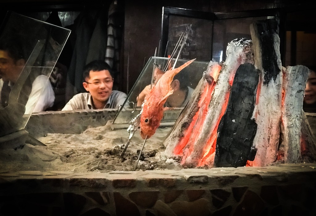 當我走進門,即有熱情的服務人員接待,而正前方就是原始燒的烤爐,爐前方斜架著烤架上,假放放置的長條木炭熱烤所有客人點選的碳烤料理是這家店的特色。眼前的師傅接到單後即刻著手準備,魚肉或須考的烤物刺穿扦子上,放在鄰近爐緣處,並非直接火烤,約20至30分鐘,當烤物魚肉的水分或其脂肪融化滴落時,料理就完成了。