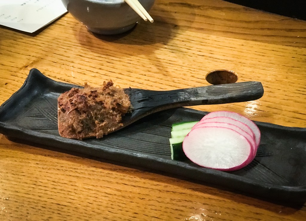 但是這烤味噌的味道好熟悉,很像在吃過的ㄧ種肉丸,重點是挺好吃的。搭配清脆的蘿蔔和黃瓜,再拌一些味噌,很下酒的小菜。