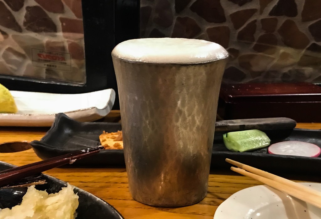 燒烤搭啤酒會發生的問題比較少,不過會一直喝,不知道為什麼,我總是覺得日本賣的日本啤酒的十分乾爽好喝,一不小心容易乾掉它。特別是今天用錫杯裝的啤酒,表面張力讓人滿足,搭前菜料理搭個魚都還很暢快,就算外面在冰冷,啤酒也不要溫喝。
