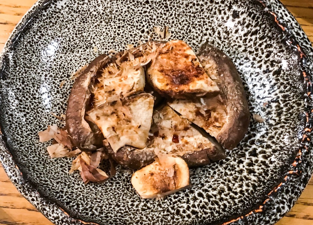 師傅撒上微微的鹽巴以及大量柴魚片扮佐,吃下鹹香美味,和菇的原始風味極搭,有那中非常乾鮮的香菇氣味,好吃。