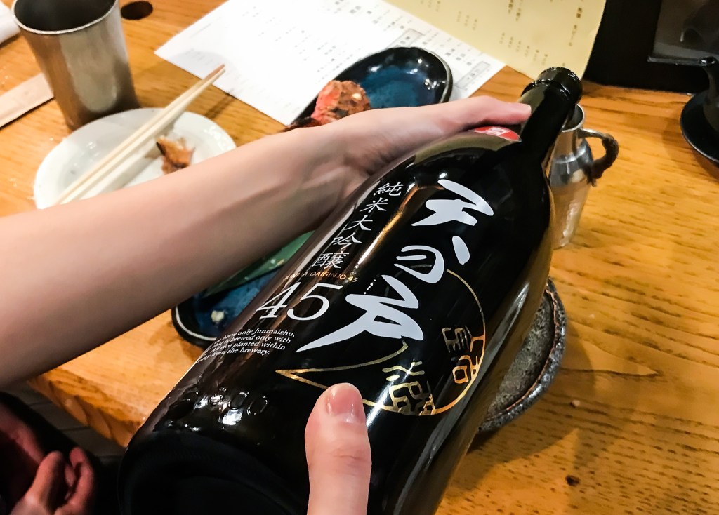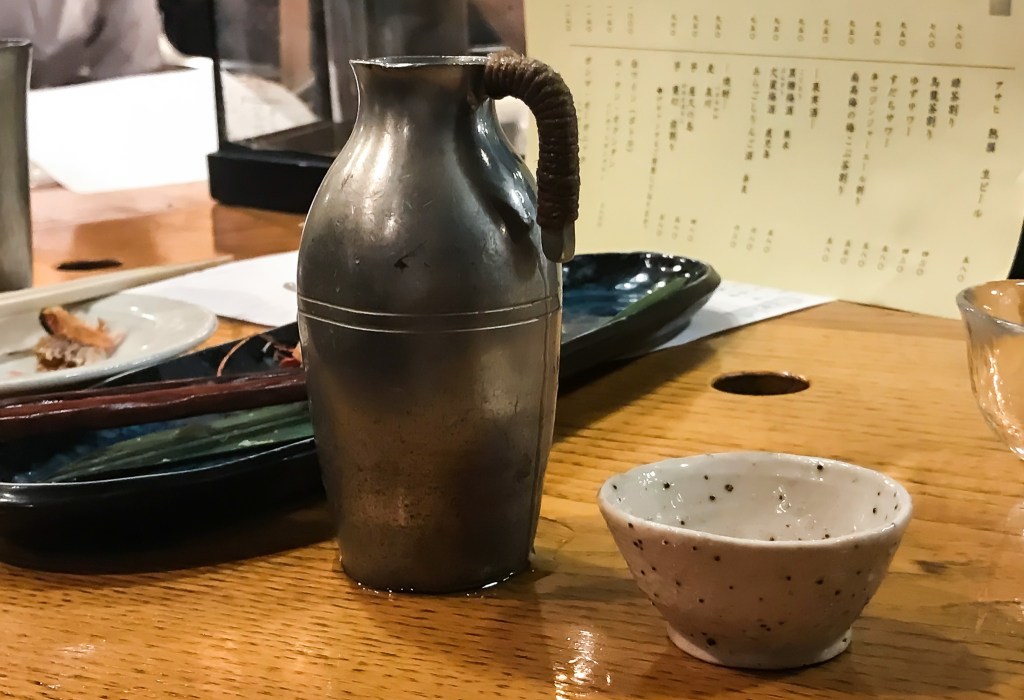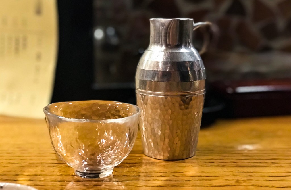 服務人員用冰錫壺裝著天之戶清酒上菜,這款是用秋田縣的吟之精米種並以40%的精米步合作為釀酒的米。