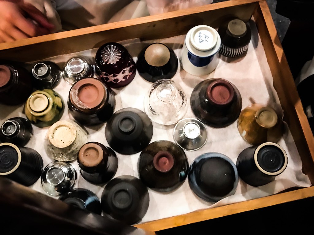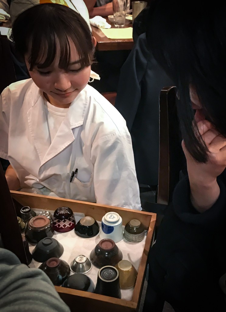 這款是擁有16.5%酒精濃度,以40%精米步合,所製作的清酒。原來喝清酒將像吃牛排一樣也要選擇用什麼樣酒杯來品味。看了下眼前女服務人員的介紹排列,當然選擇用什麼樣的杯子,我實在沒什麼概念的,因此隨性選擇一款杯子來喝吧。