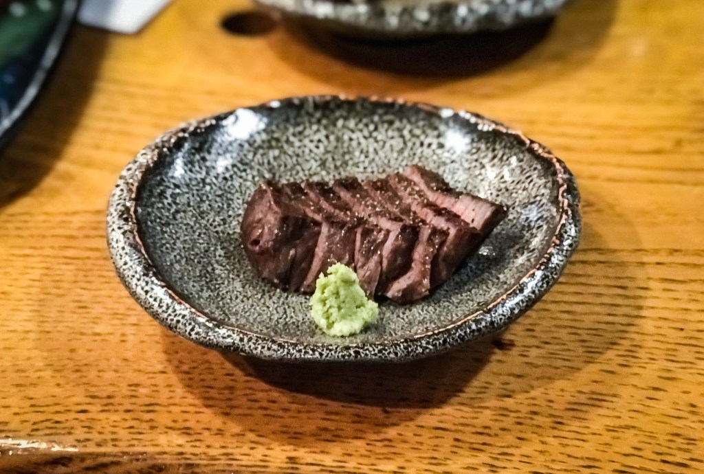 上菜後夾起一塊入口,肉質柔細彈嫩,還有烤肉鹹香的肉汁滋味,最大的收穫是加上山葵,而且也是選用德島的山葵,它不嗆辣,還有點奶油香,吃起來像加了奶油的牛排,帶微微的植物香。