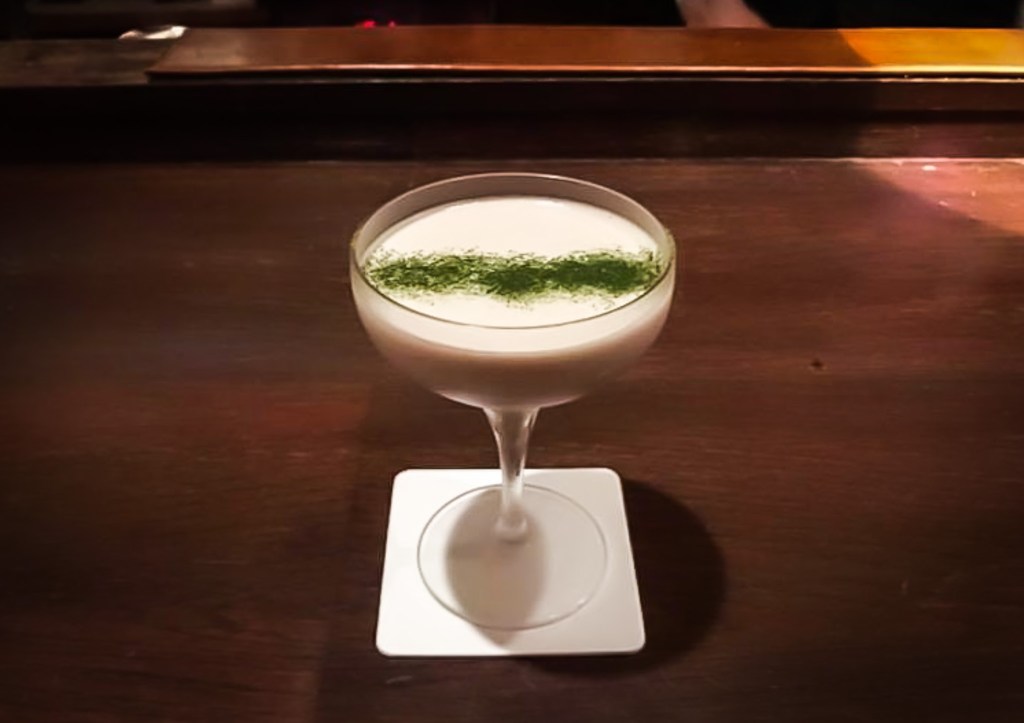 看來今天還行,所以選了第四杯調酒,決定來杯Signature「Nightcap in Osaka」(Remy Martin VSOP, Dry Red Bean Paste, Meiji Milk, Green Tea Powder)。