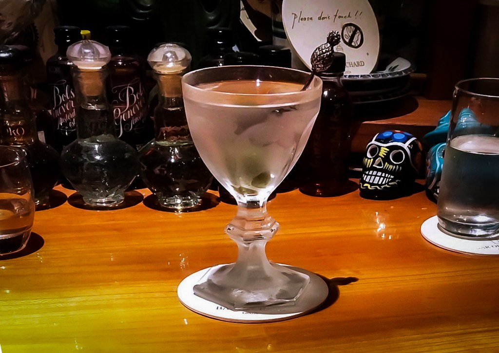 在攪拌時彷彿便能感受到一種清香,是松子酒和相愛久的調和。飲下,辛口帶勁,如007要準備執行任務一般,不過攪拌調和的冰涼以及香氣確實十分迷人,也帶有冷凝感,儘管開始辛口有近,但尾韻還是能展現馬丁尼的優雅以及一種海風鹹口味。搭配顆醃漬的橄欖,單吃鹹口,搭配一口馬丁尼彼此抵銷一些,緩和一些,舒服輕鬆。