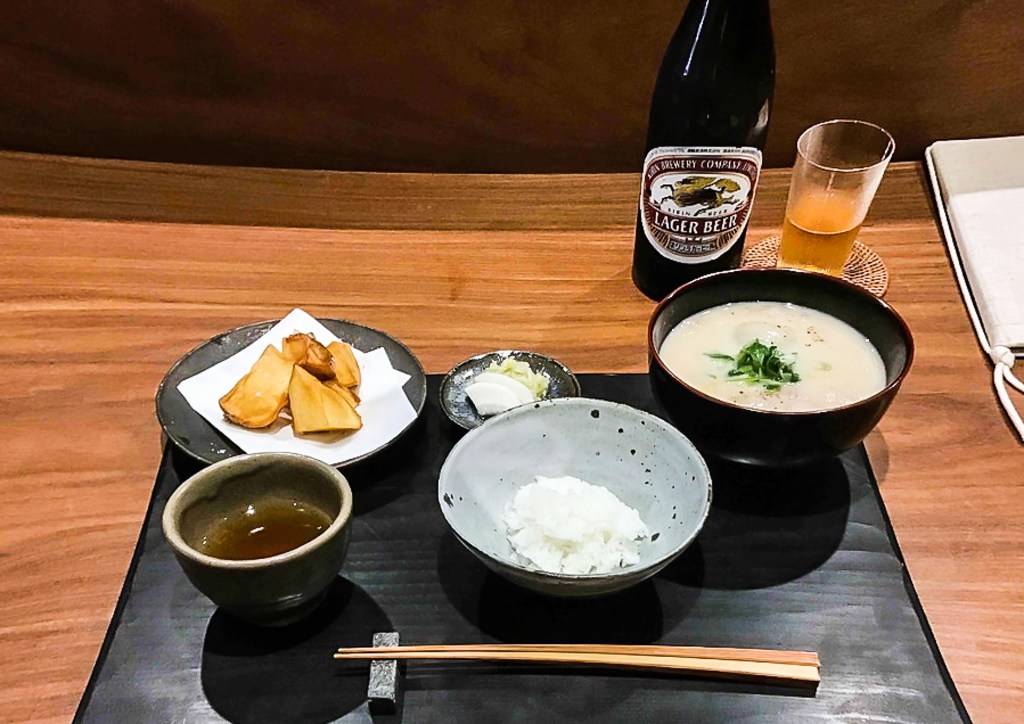 事實上這道前菜是一碗裝乘著玉米筍,櫻桃蘿蔔切片、山葵、湯葉以及以橄欖油與鹽來製作調味的料理。取起筷子夾起並放入口中,這滋味是濃稠而有豆漿的氣味,拌上山葵則多一些辣嗆風味存在,適合口味清淡者,所以喝啤酒還真對味。