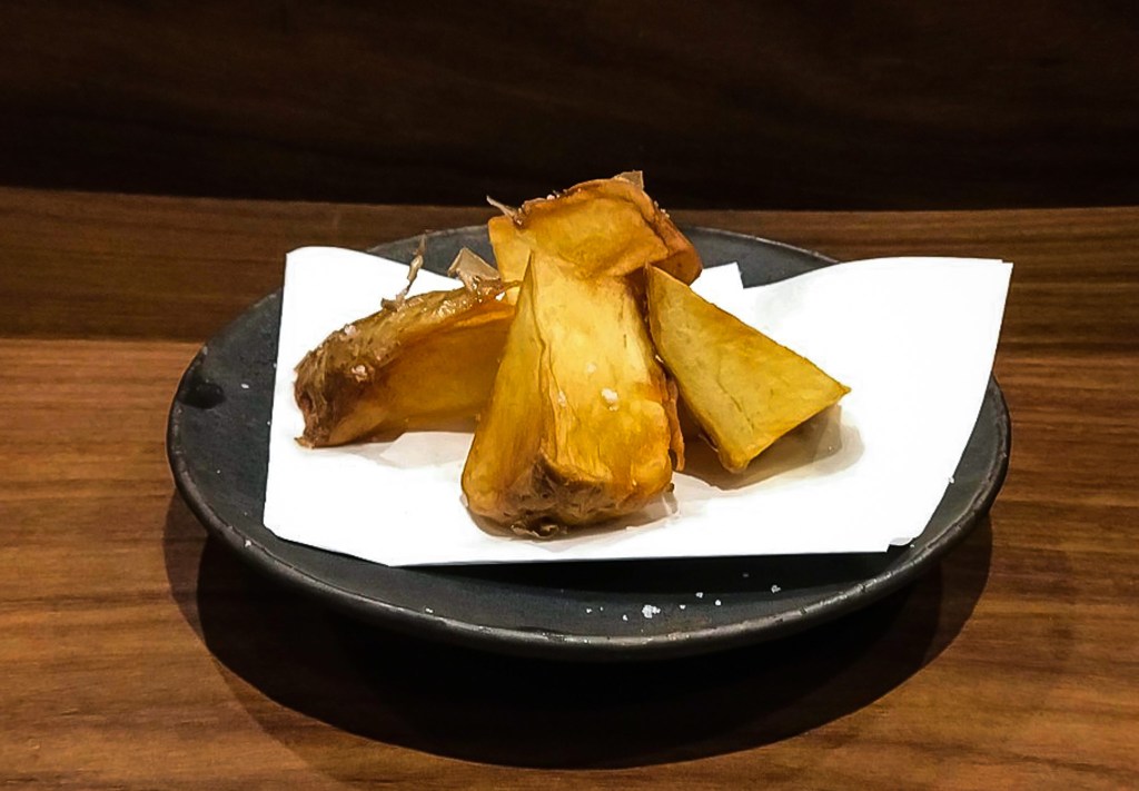 事實上是我多點一道前菜,吃下這初炸的滋味,我還以爲是炸蕃薯,因爲炸出一種蕃薯香氣。且炸的柔度剛好,不會太爛,內心微微的脆後軟嫩,金黃外皮,加些海鹽,美味。