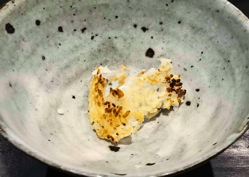 最後廚師讓我試試米飯的鍋巴,他從鍋裡挖起置入晚鐘,然後撒上點細片海鹽。我得說最後試試鍋巴,加些細片海鹽,脆硬如餅微微焦香,口感舒適,滿足了這幸福的早晨。