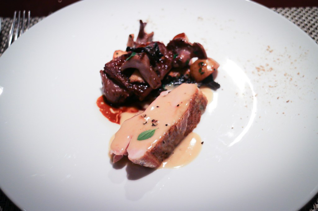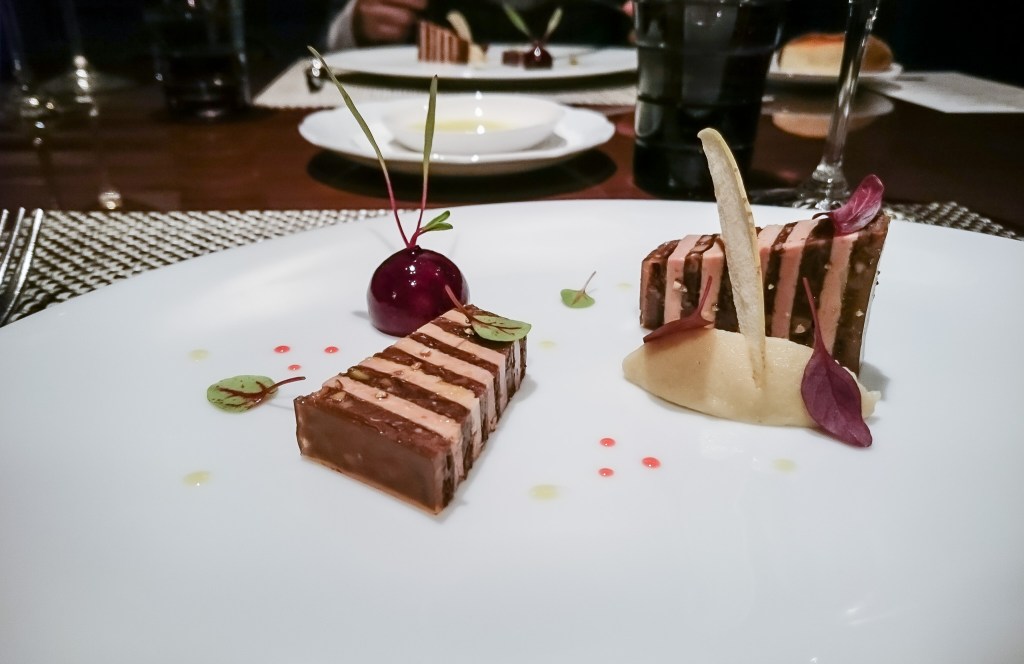 這道前菜精緻而精彩,是一道以鴨肝料理為前提的餐點。它可以用兩種不同口味呈現,可陪襯的菜餚還有以及油封蘋果,就像是甜點一樣的感覺但與鴨肝一起食用可降低一些刺激之味。