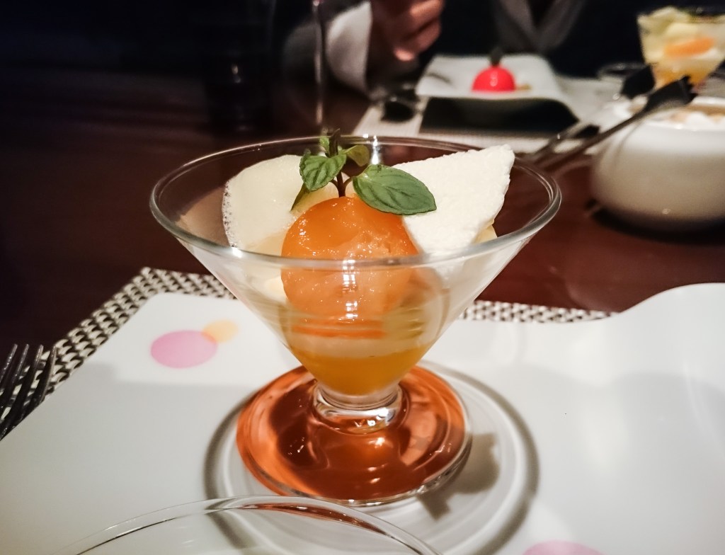 另一道是LA MANDARINE,這樣的名稱應該是去用產自中國的橘子,所以用「滿大人」稱之。這是桔子肉料理的小品,其中穿插了蛋白餅以及橘子口味的分子泡沫,底部也有桔子製作的果泥優格,也是道清爽的甜品。