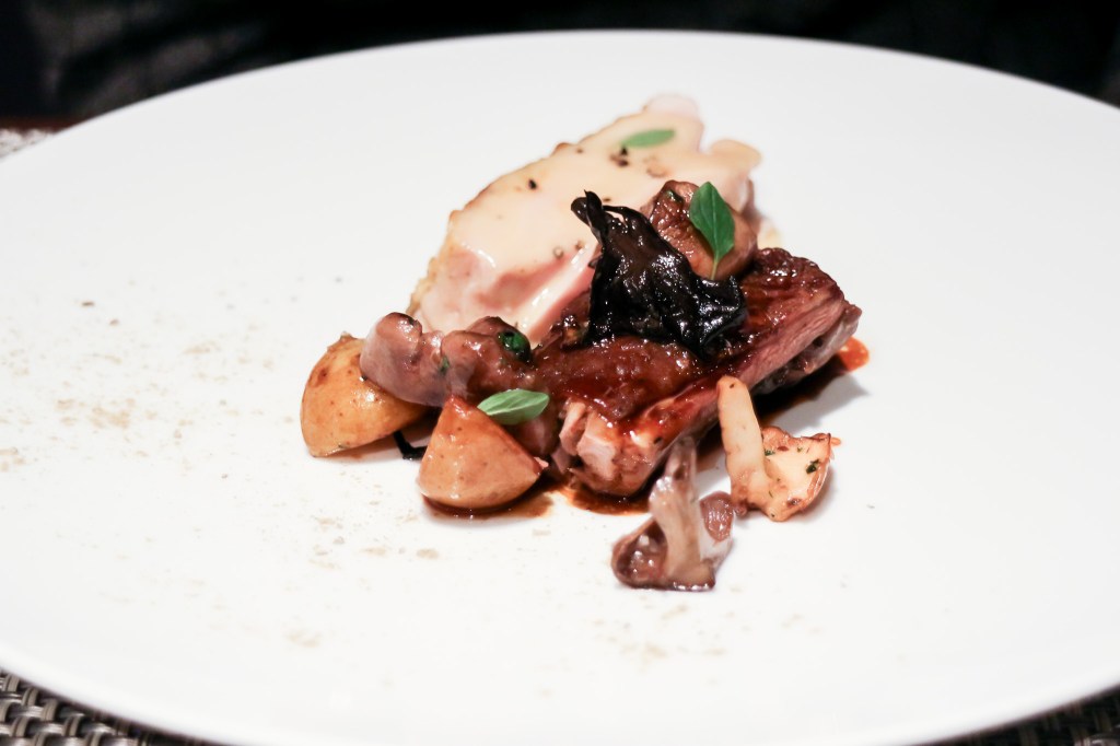 第五道是第一道主菜「Roasted Guinea Fowl fillet and leg served with mushroom and potatoes, sauce suprême」。