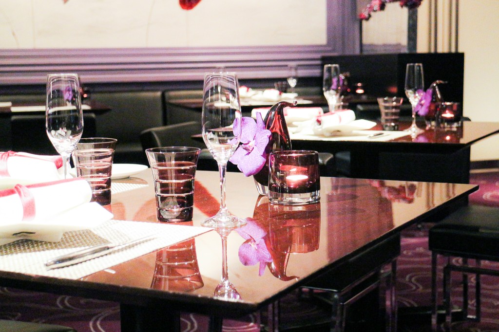 這裡的服務貼心,從進門後不需要推開,主動有侍者營向前來開門便知。當然,來這裡必需先要check訂位,一切活動才能開始。我在訂位單上找了個半天,我忘記老妹是用她的名字幫我們訂位,在比對過資料無誤之後,侍者們協助我們脫下外套並寄放行李。接著,引領著我推開眼前這扇門,接著進入La Table de Joël Robuchon的紫色世界當中。