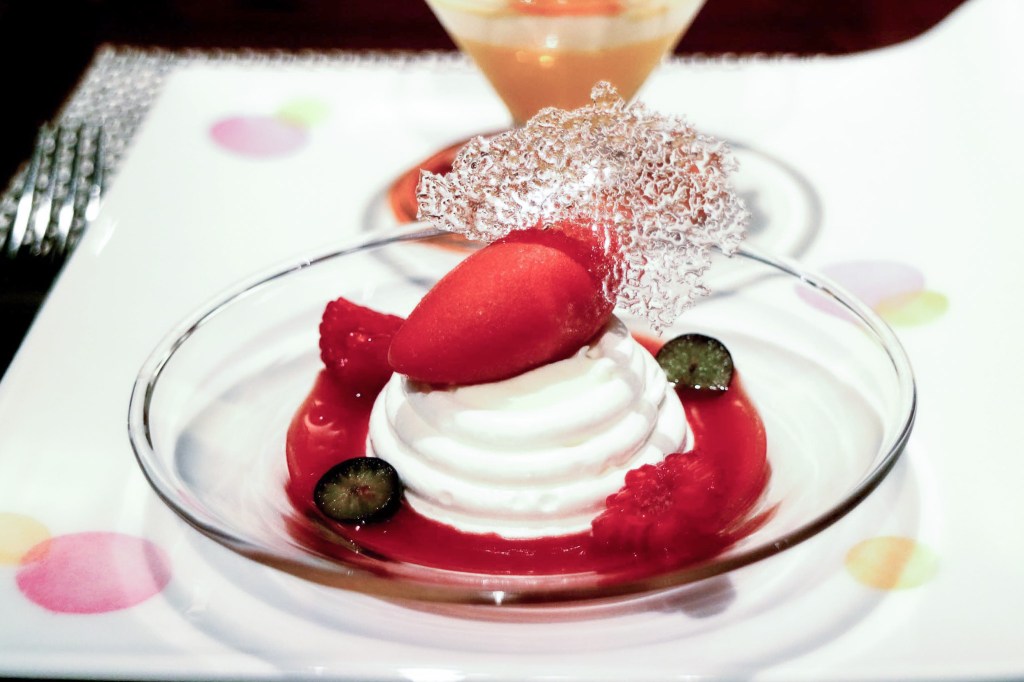第一款是LA CREME D’ANGES。它以紅色莓果為主的甜點,中間佐了起司新鮮奶油,周圍淋上了酸甜的紅莓果漿還有草莓果醬,並附上一球草莓冰淇淋以及焦糖片,酸酸甜甜的口感抵觸了主餐之前的滋味。