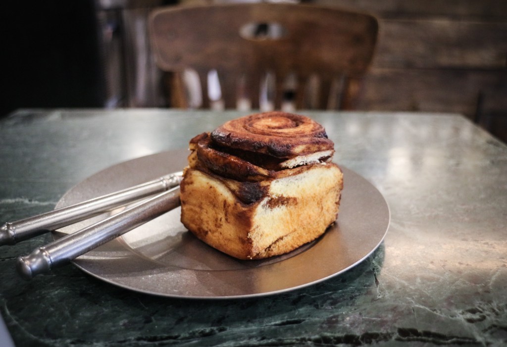 取刀切下一塊,溫熱麵包感到肉桂餡的甜味與濃香肉桂氣息。與口中唾液產生美味香甜的化學作用。屬於反應紮實的肉桂卷系列。