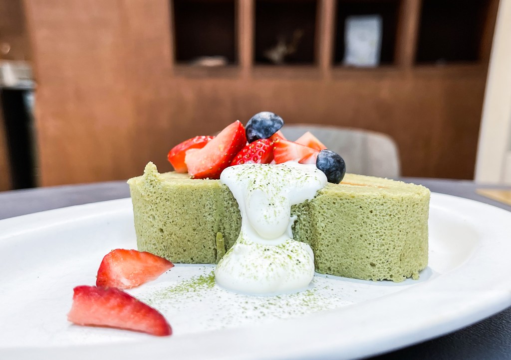 茶香味十足的生乳捲切起一塊,表現綿柔感,抹茶餡滋味清楚,伴隨的奶油帶著奶香甜甘。配上水果而有清新果氣,也略展舒適之味。