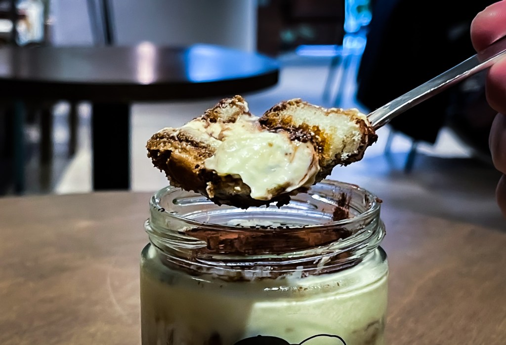 用杯罐裝置的提拉米蘇,其咖啡酒香,馬斯卡彭奶油以及手指餅乾等的調製、靜置十分恰好。