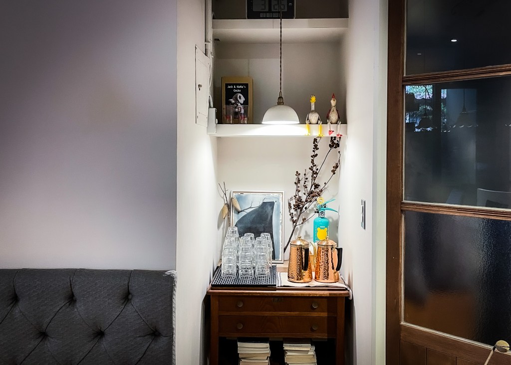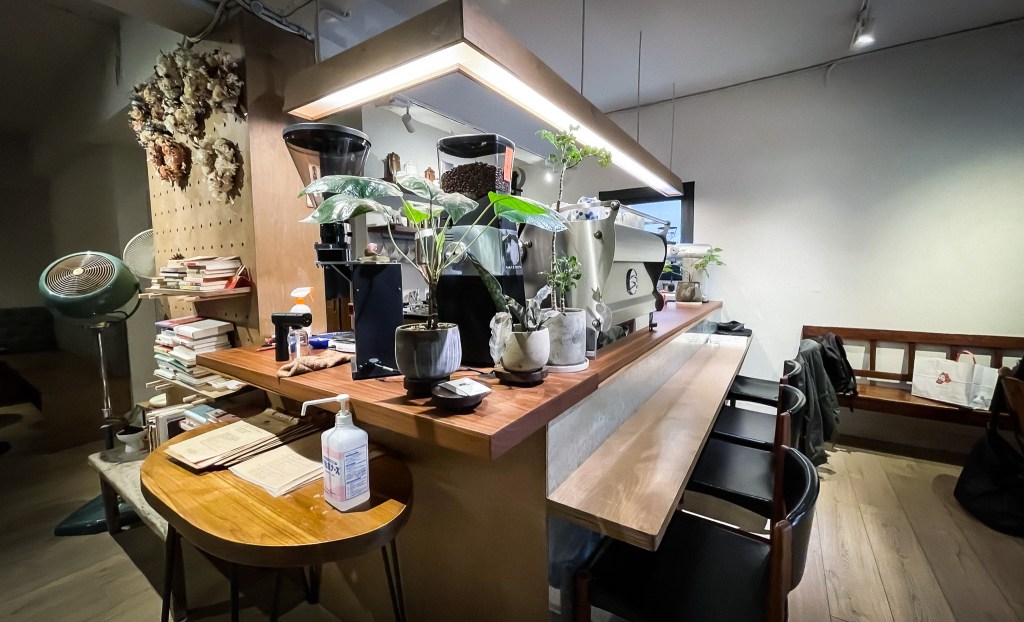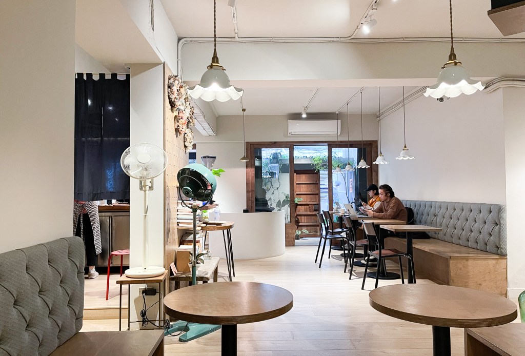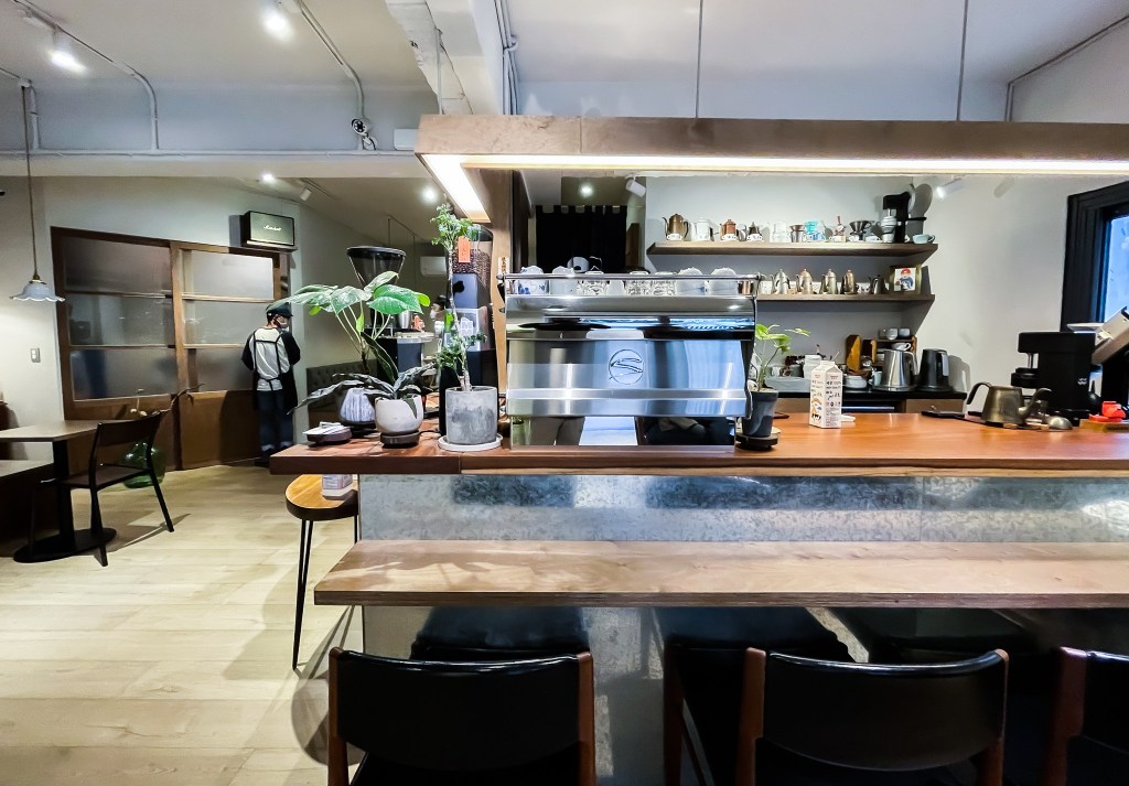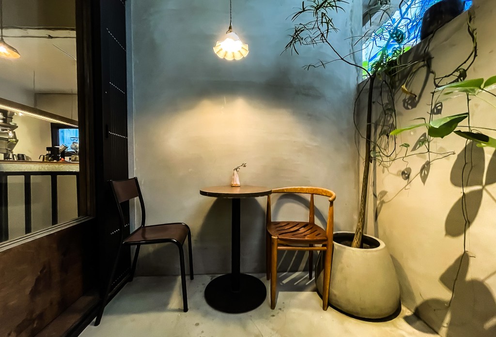 店裏木桌昏黃,暖色系色調,空間雖然為早期老建物改建空間,但設計規劃出還滿舒適的空間感。仍有小院子,盆栽植物攀附門牆,看來沒有選錯地方。