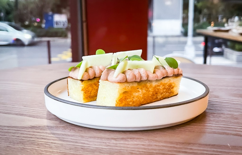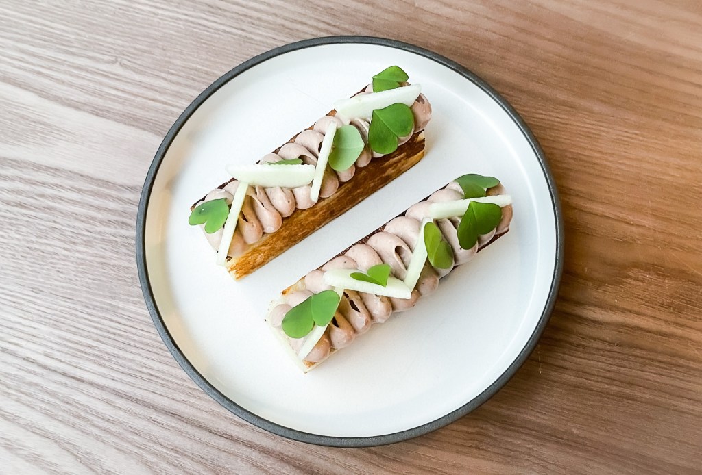 搭配一道小食配自然酒,我選擇了「雞肝慕斯」(雞肝慕斯、烤牛奶吐司、蘋果醋凍、新鮮青蘋果、作醬草)。