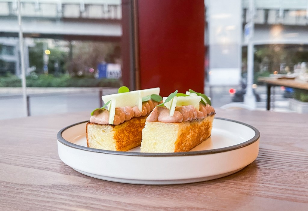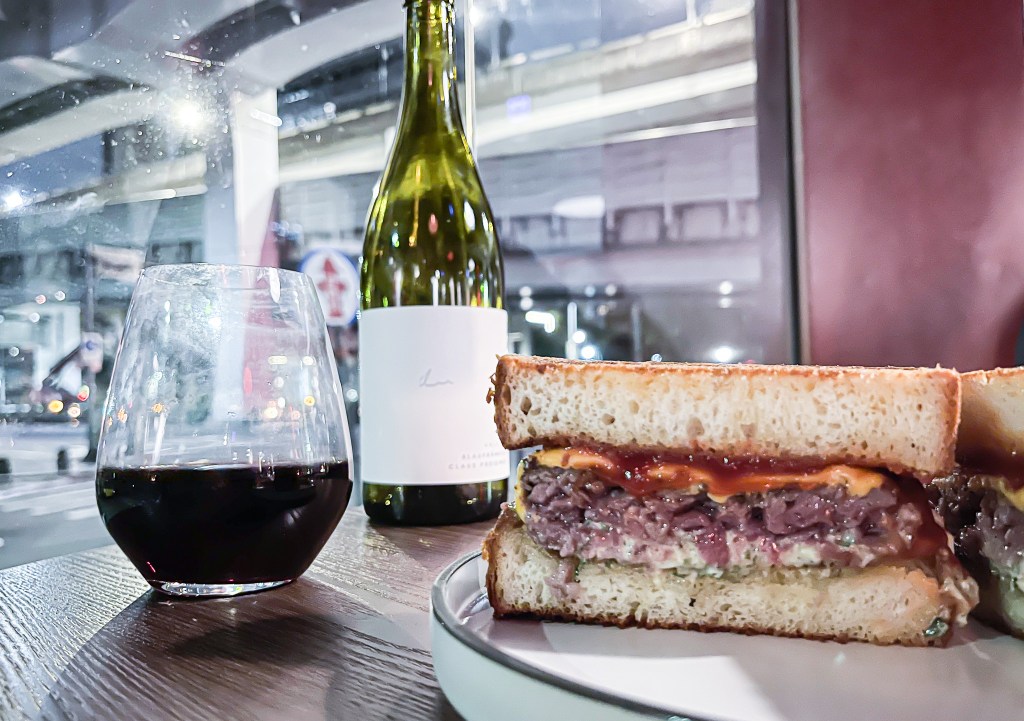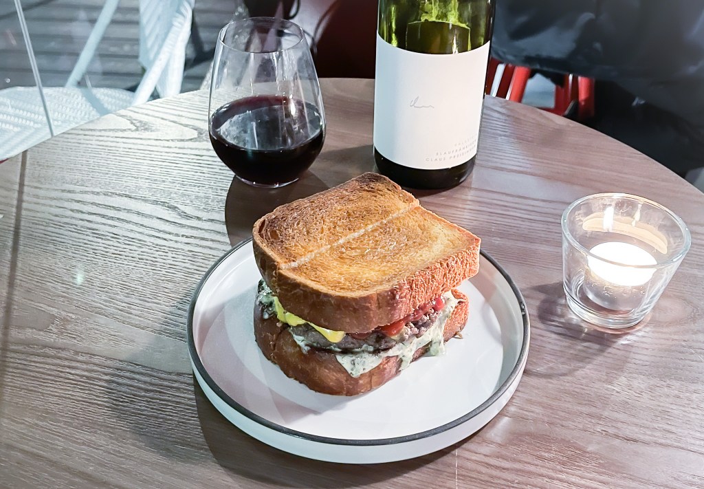 倘若就這麼一道有點可惜,就決定試一試主菜的和牛肉三明治搭配這塊奧地利紅酒的感受吧。「和牛起司三明治」(和牛肉、蛋黃香草醬、切達起司)。
