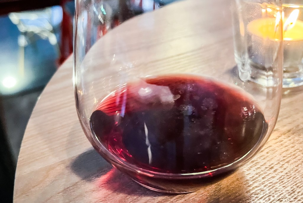 若平視反光才顯酒的深紫深黑,不過在無梗杯稍稍傾斜,便轉換出葡萄酒的淡雅;我搖晃,酒痕沿杯腹滑落,如片而後分痕,俐落感,酒質潔淨無雜質。