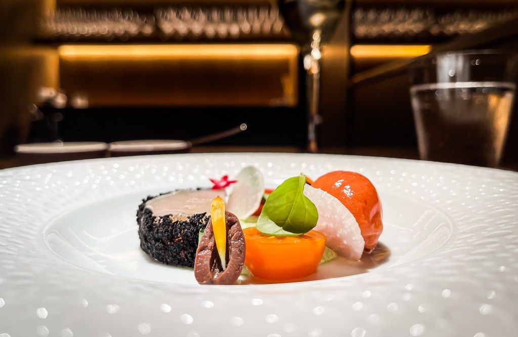 第一道前菜是「鰤魚/蒔蘿/番茄」(Buri、Tomato、Dill)。以鰤魚還有淋上時羅奶醬,一旁有番茄冰沙等等搭配番,這一道似乎喚醒了我對法式料理的熱愛,因為看起來華麗但這樣的搭配與配置卻十分契合。