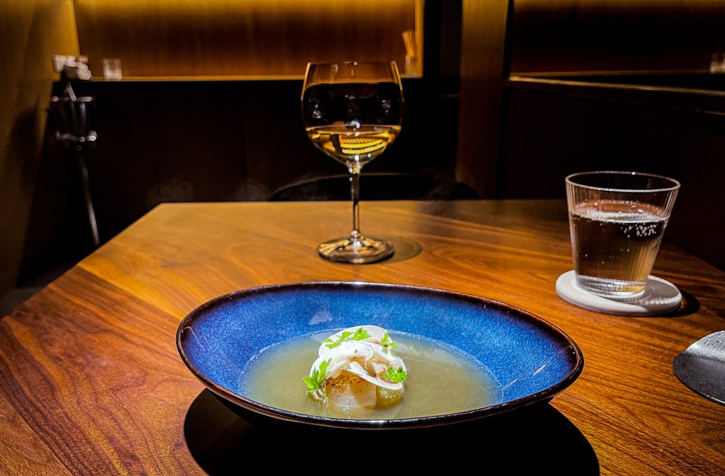 以北海道生食干貝為主角,包藏著綠竹筍以及刨片蘑菇搭上金華火腿與老母雞清雞湯(冀園雞湯好像也如此)此外還有點胡椒等等,這道湯品看起來比較樸素正常。