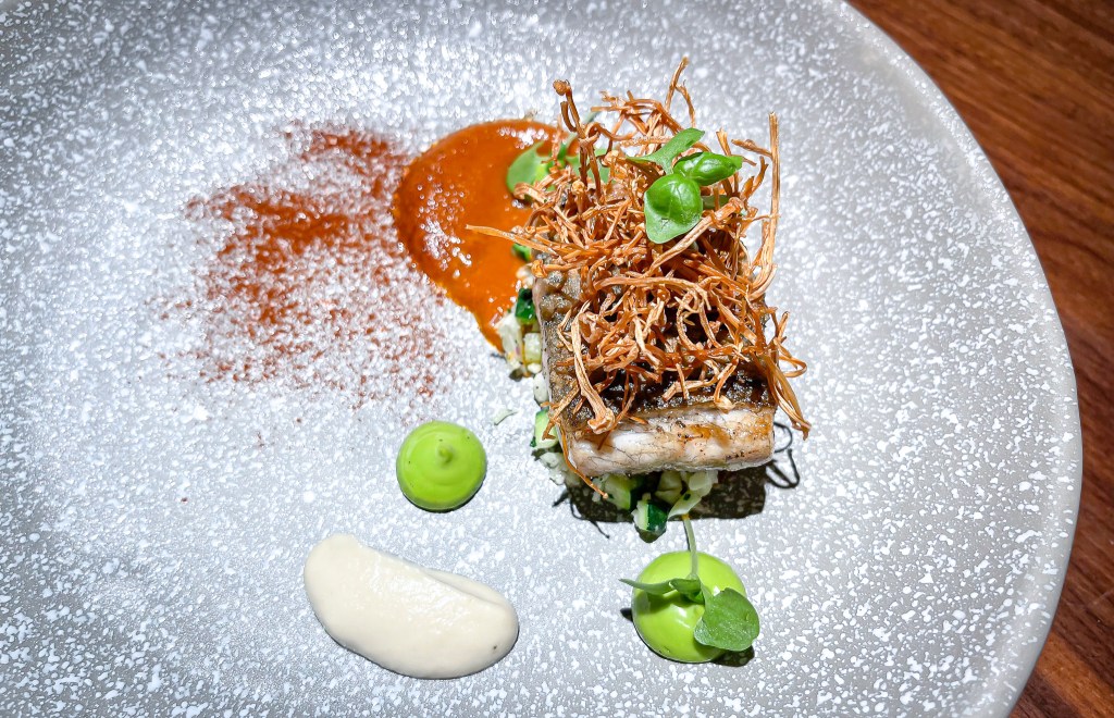 經過Xavier介紹這道是相當地中海風味料理,香煎鱸魚皮而脆,上頭是抽乾水分的金針菇,襯底的是剁碎的節瓜們,此外醬料豐富,有白花椰菜泥、巴西利奶油以及西班牙紅椒醬與辣椒。
