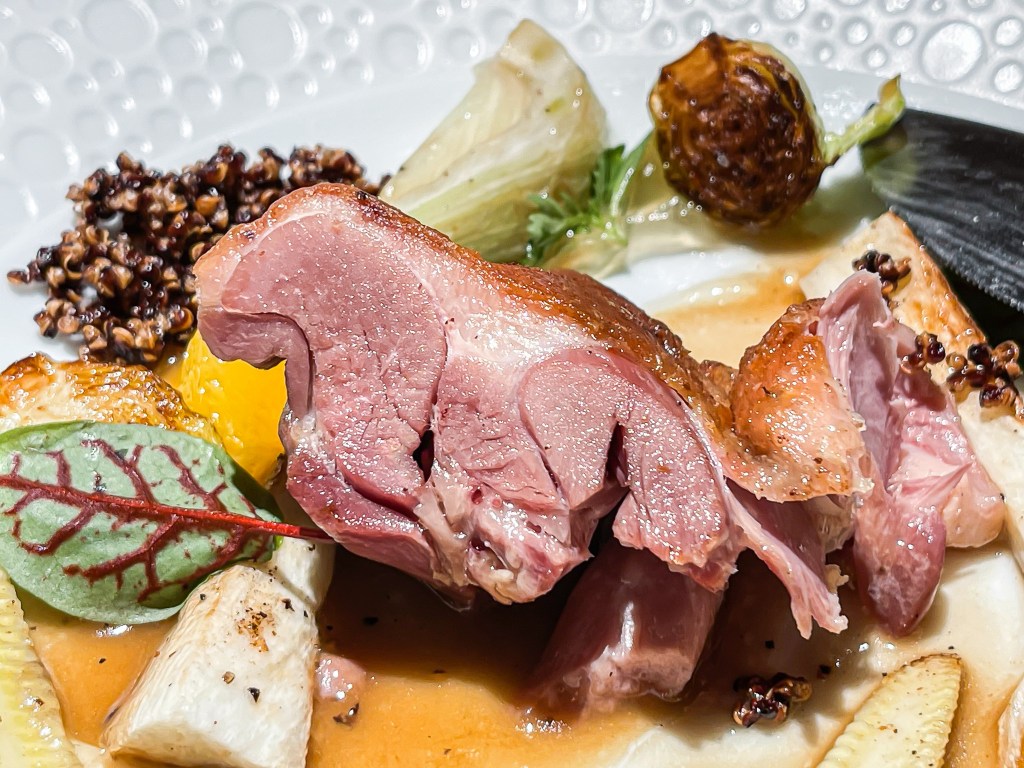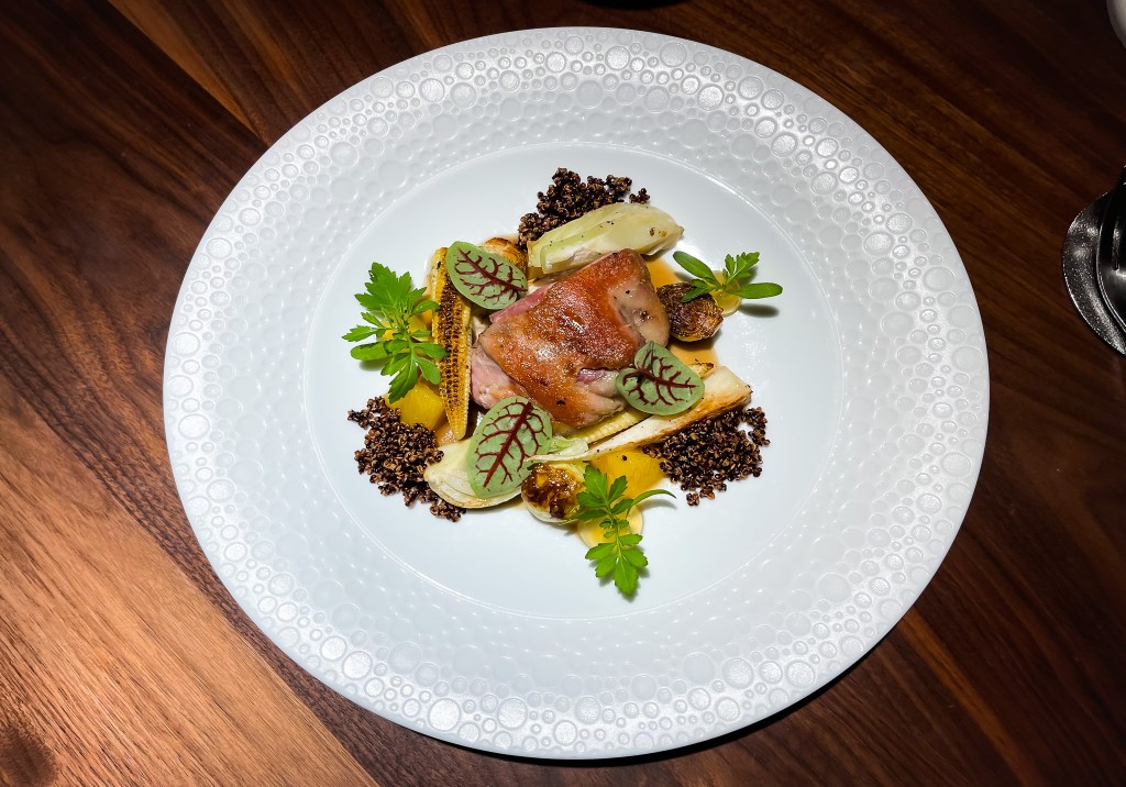 經過介紹,今天這款油封鴨腿主菜是一款非典型的油封鴨腿肉,當然腿骨已抽離,襯底是柳橙與干邑製作的醬汁,脫水的藜麥焦脆、炙燒的玉米筍、孢子甘藍、甜菊葉、紅酸模以及檸檬做成的透明泥、鳳梨果肉..等等。
