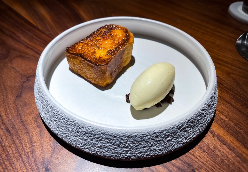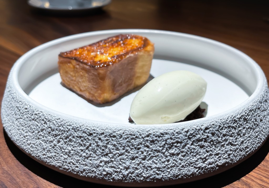天啊,這道料理是甜食愛好者的天堂,一塊吐司製作的內裡有著秘密水潤浸濕了內部但感受如布丁般口感,而味覺以及口感也有類似,吐司外層炙烤焦香,甜美可口。
