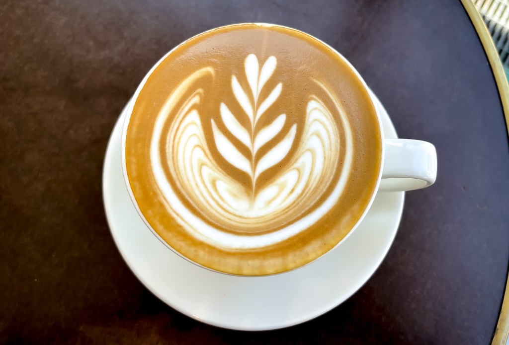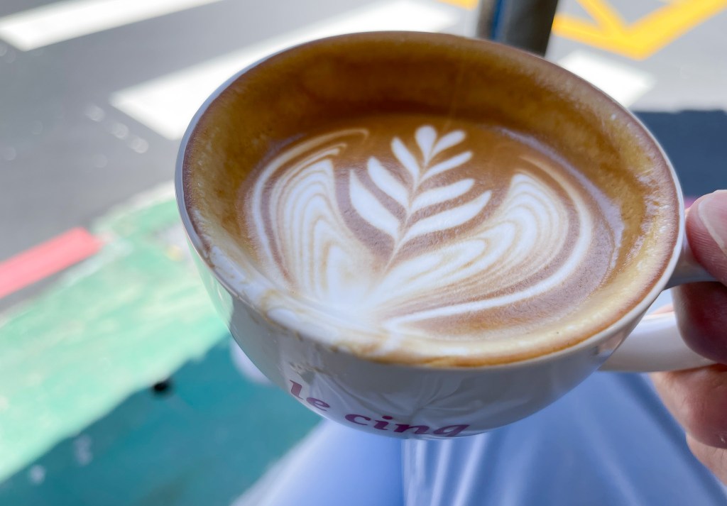 留白印上店名的咖啡杯,紮實的焦糖澀咖啡泡沫以及拉著均衡花束的咖啡拉花,襯托今日的美好氣候。