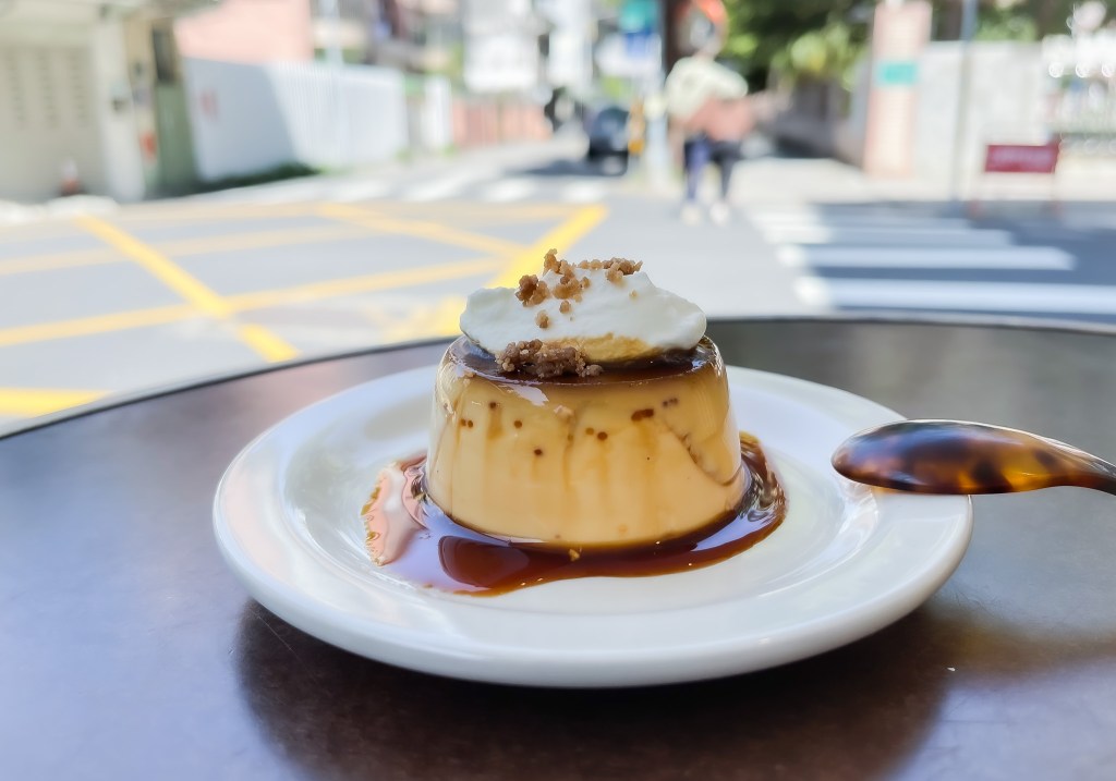 確實悠閒,儘管有涼風,儘管陽光明媚,雖然外面位置避不了一些水溝味,也避不了網美網帥的身上香水,不過咖啡拿鐵符合我的味口,布丁也甜到我心裡,因此抵消美中不足,還是符合理想。