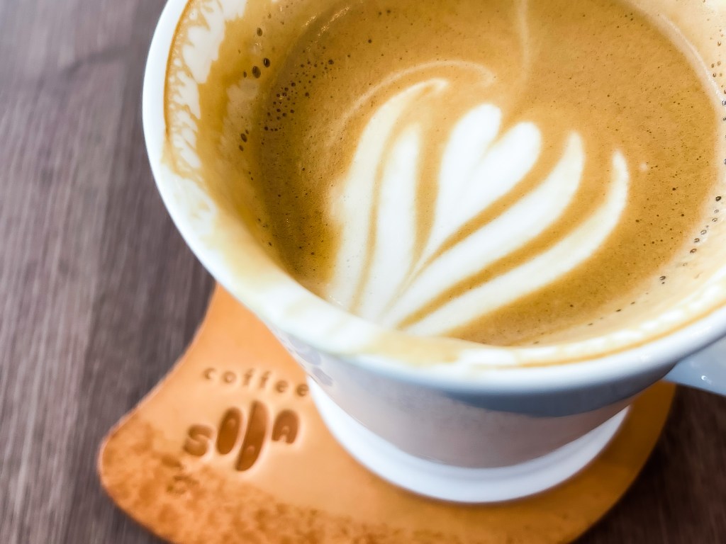 輕亞淡淡的牛奶糖色調,中間趁著一朵小心拉花,在白色純樸的馬克杯以及印製的皮革咖啡墊上,訴說著這間咖啡館的風格。