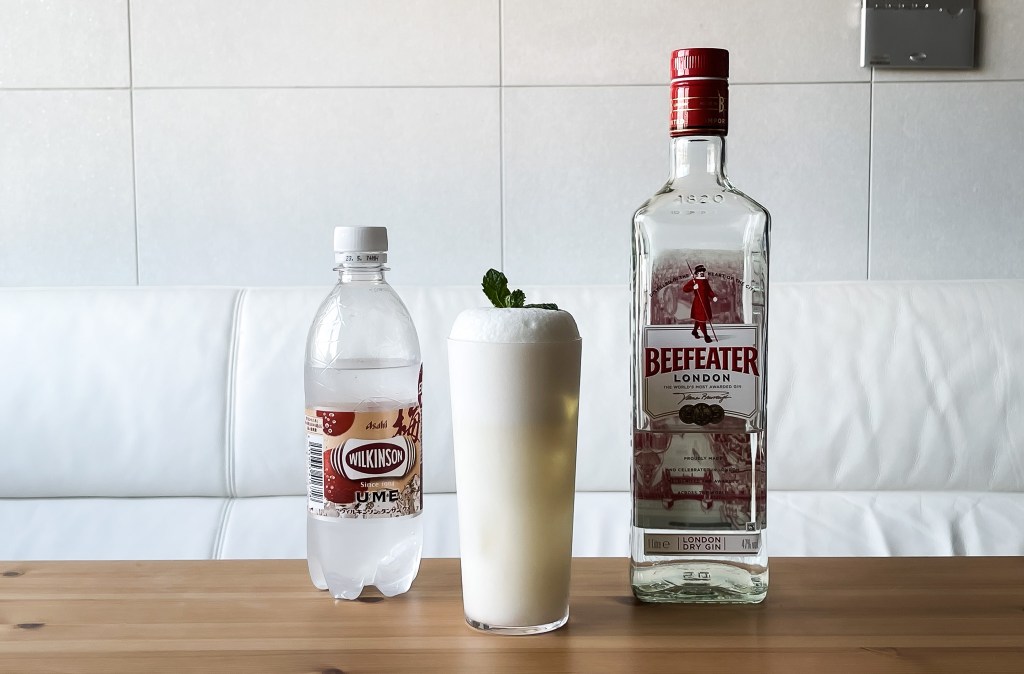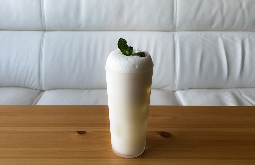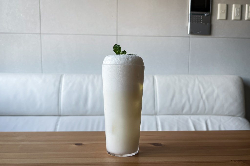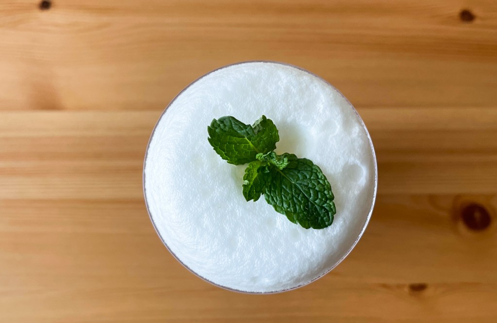 好的,鼓起的,濃厚的,如蛋糕般的立體畫面出現了,然後取了薄荷葉作為裝飾,一杯Ramos Gin Fizz就完成了。