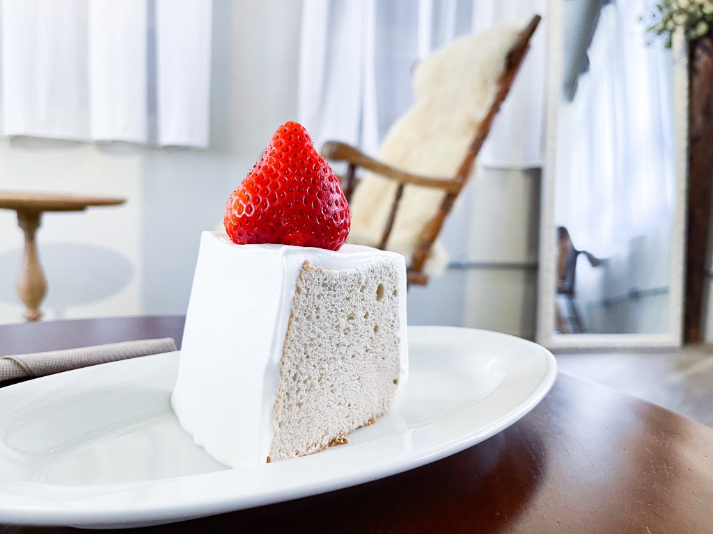 這塊戚風看起來不得了。外層的雪白奶油,淡雅的茶色係伯爵茶調,不僅如此,還有顆大草莓置頂,且還撐的久。